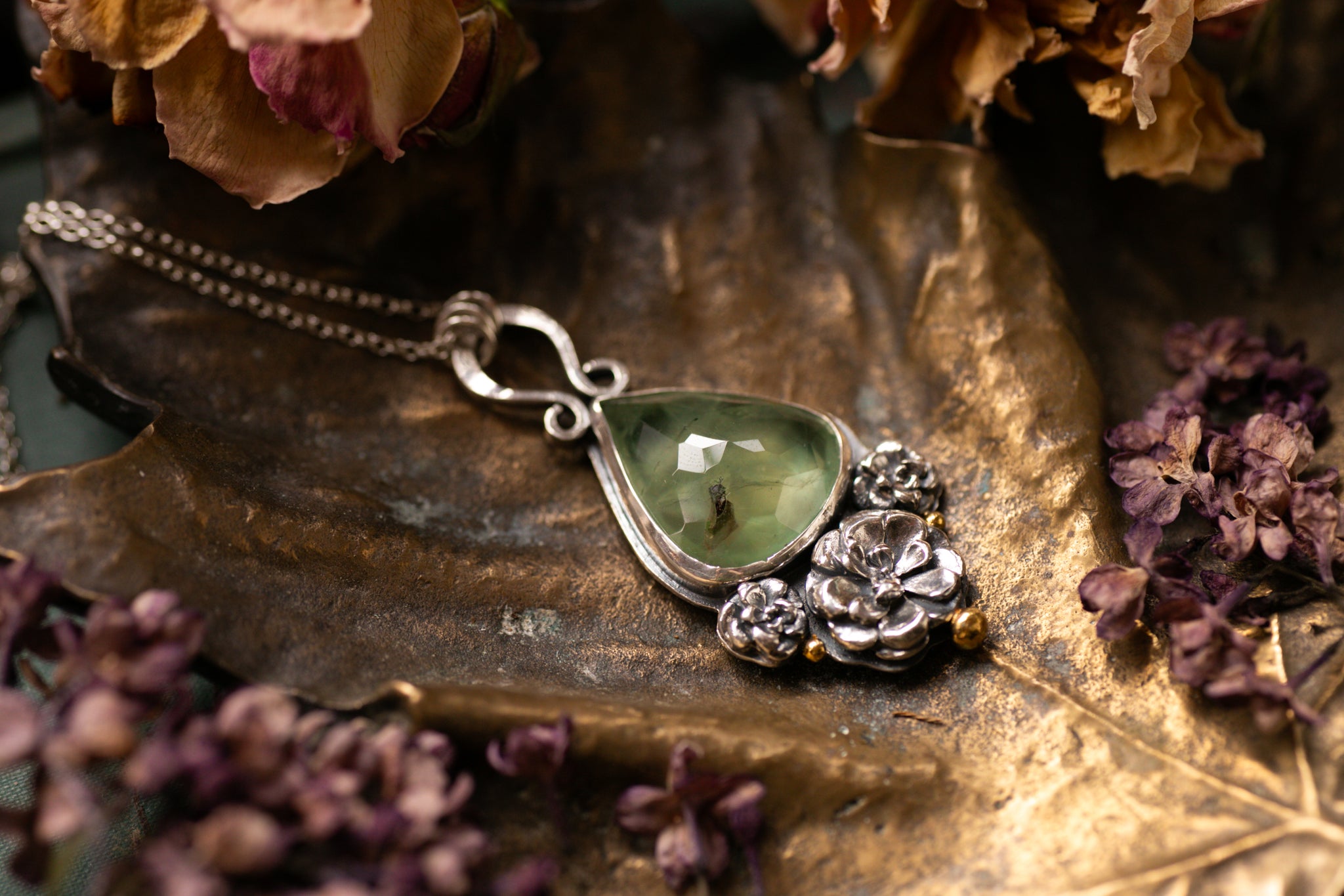 – Sold OutThis one of a kind pendant features a gorgeous big mossy green Prehnite teardrop sitting...