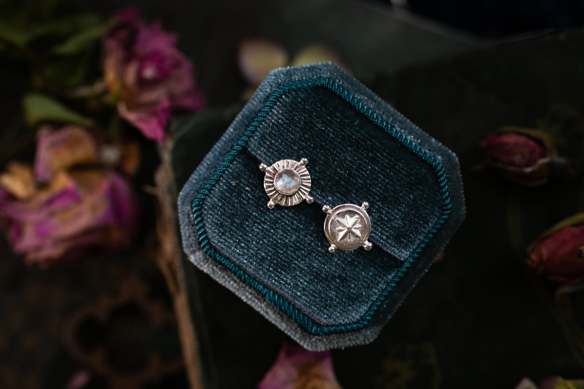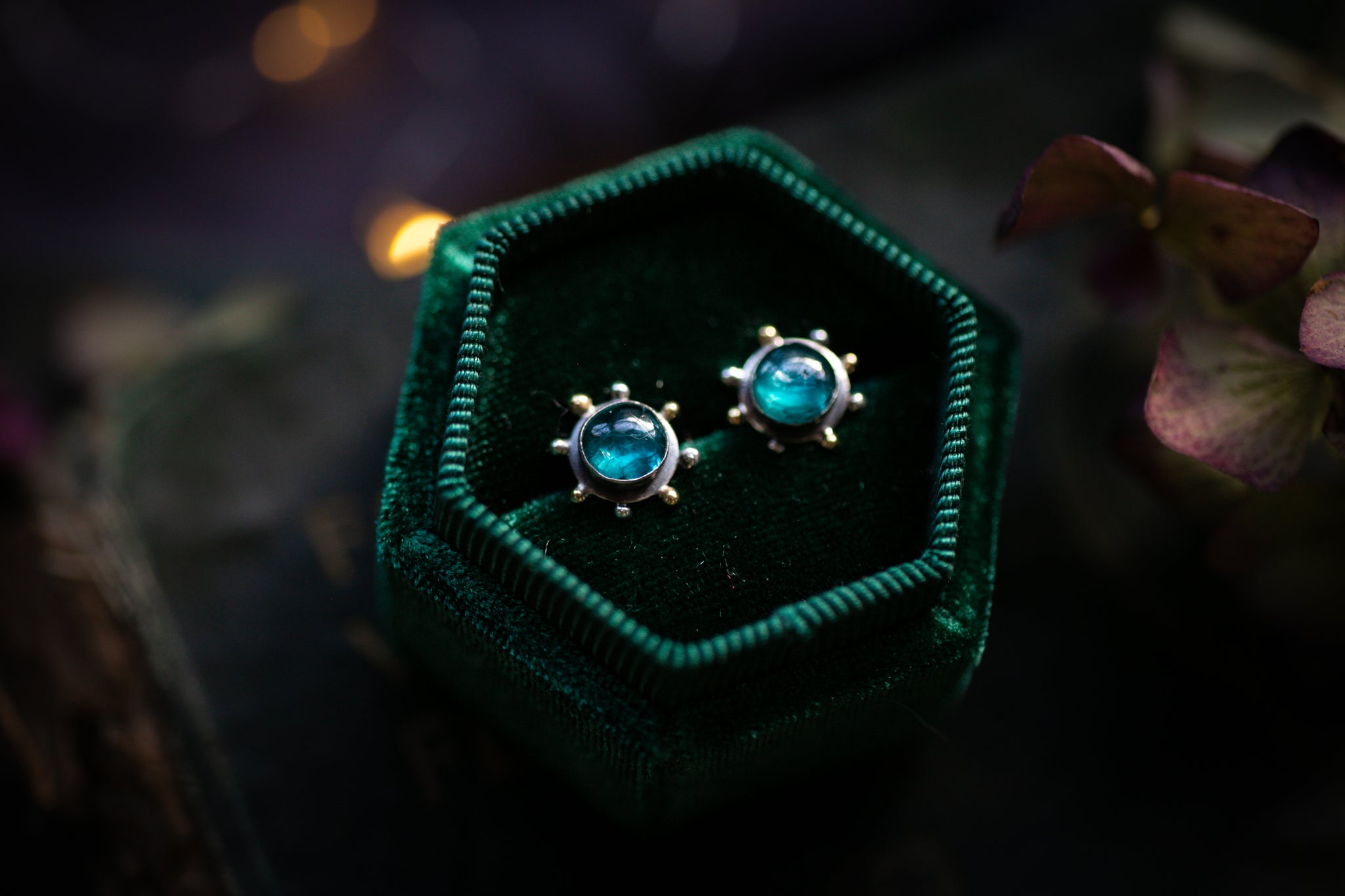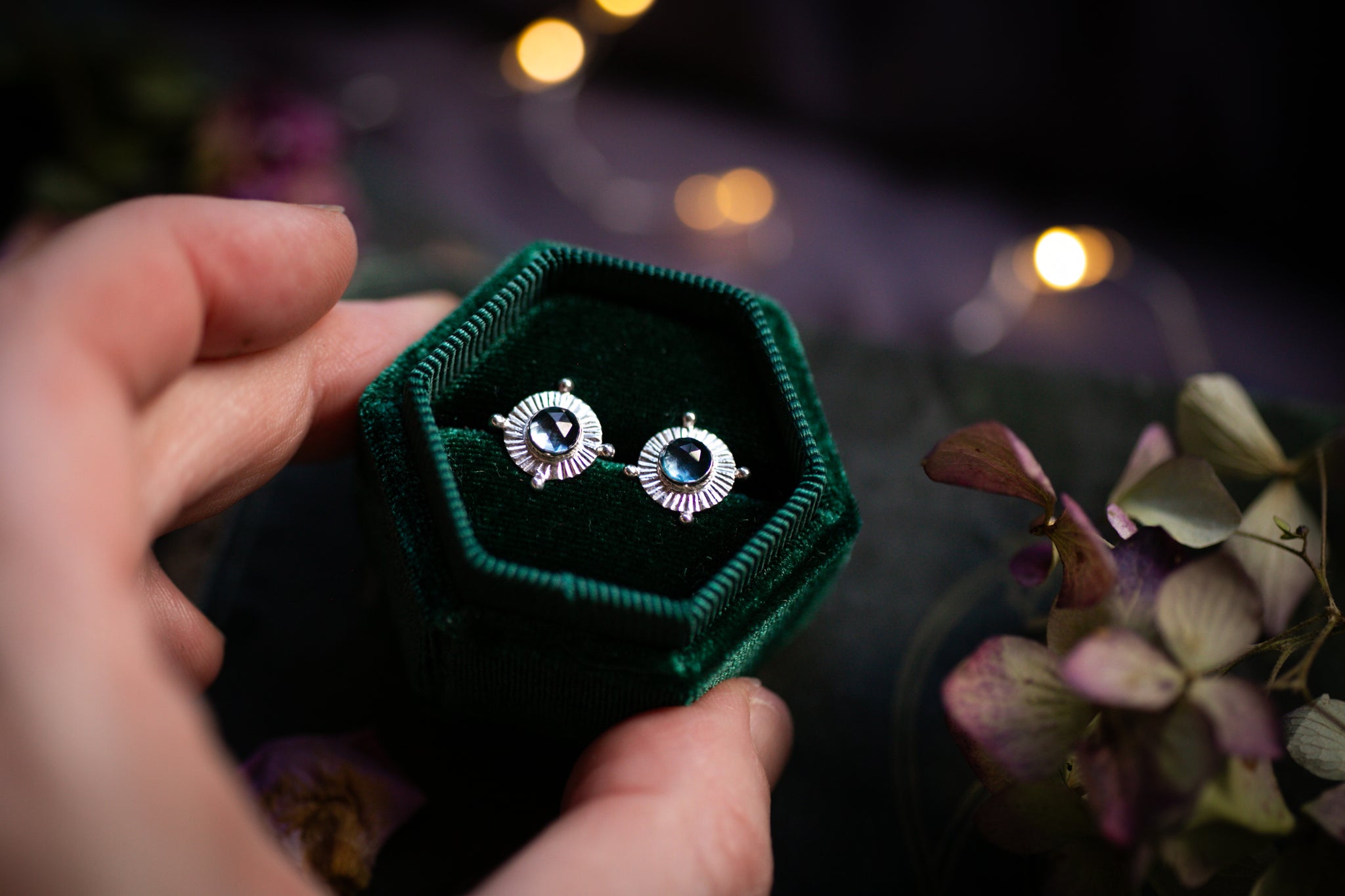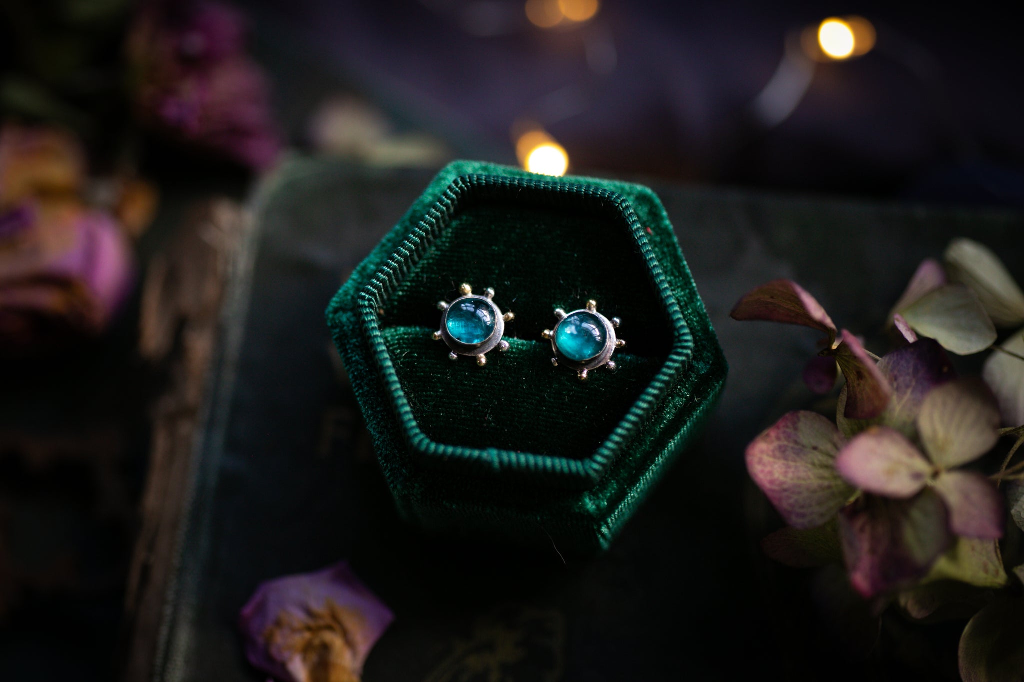 These little celestial inspired earrings feature the most gorgeous teal blue London Topaz rosecuts set...