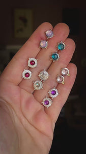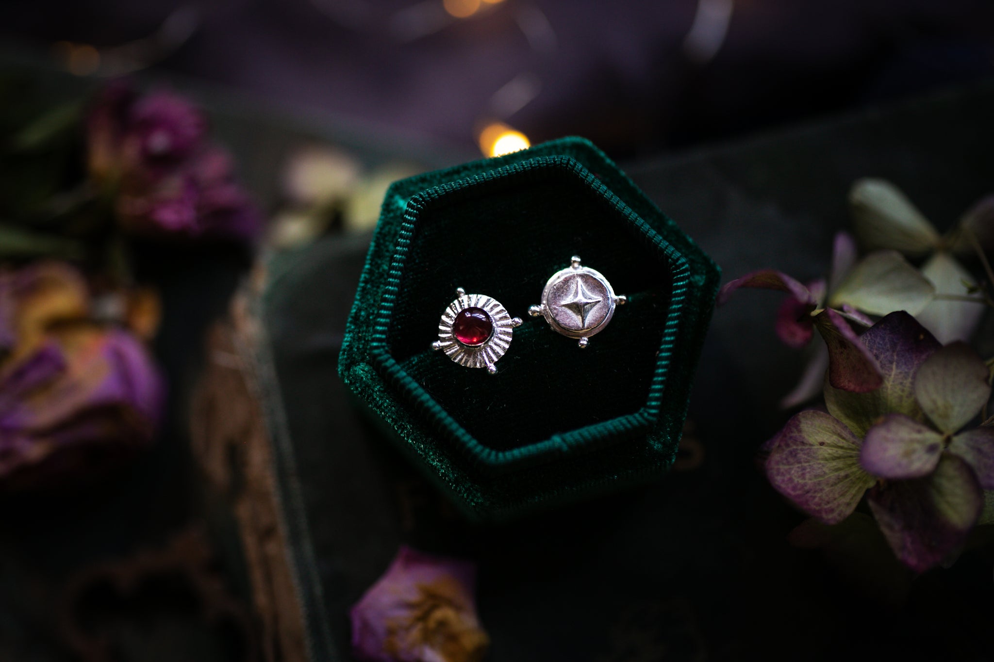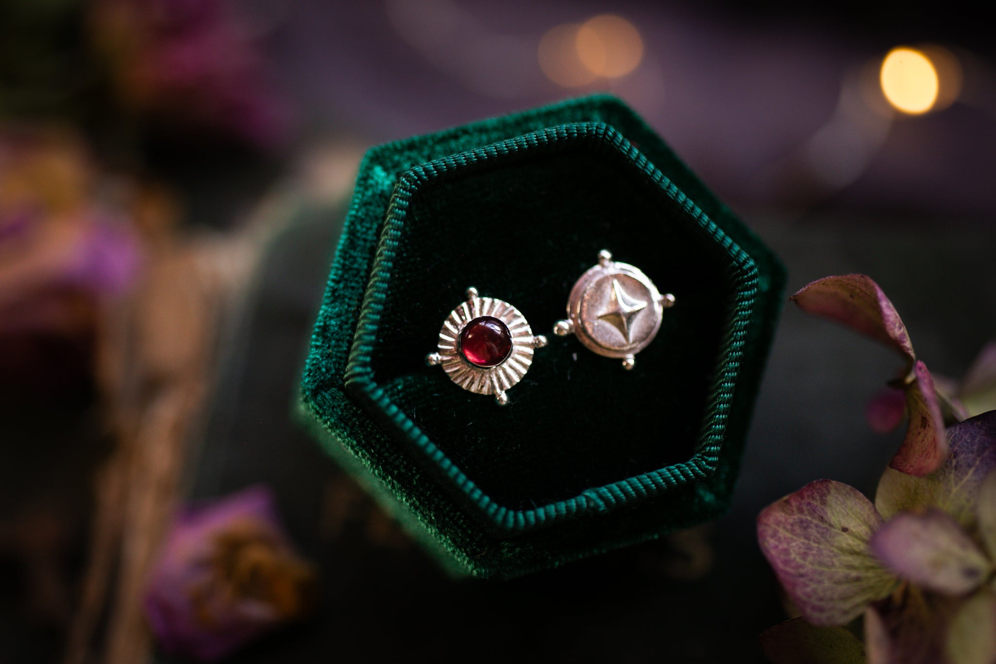 These little celestial inspired earrings feature the most gorgeous berry red Rhodolite garnet set in...